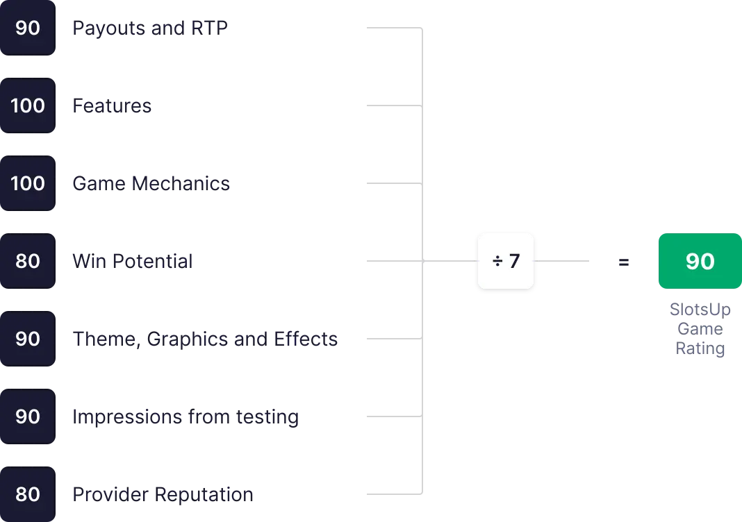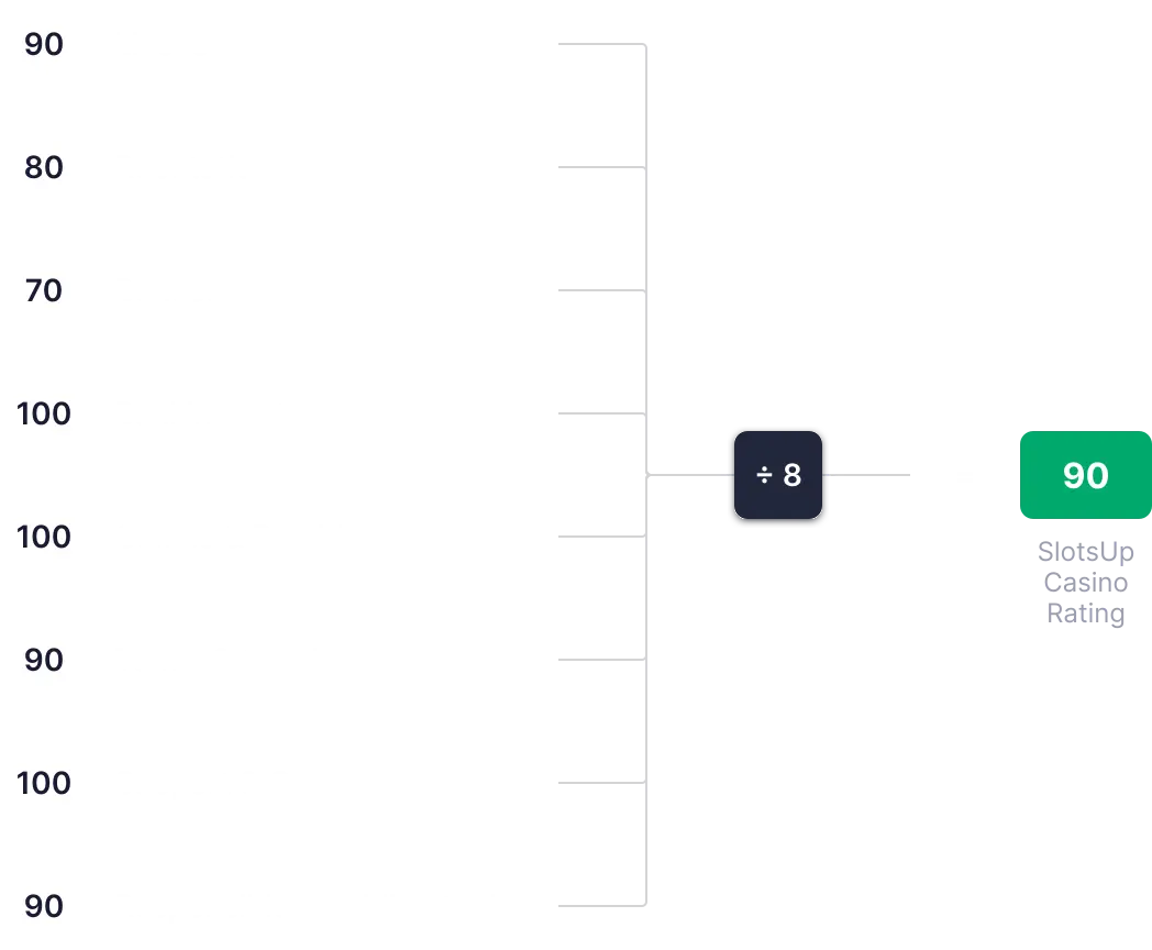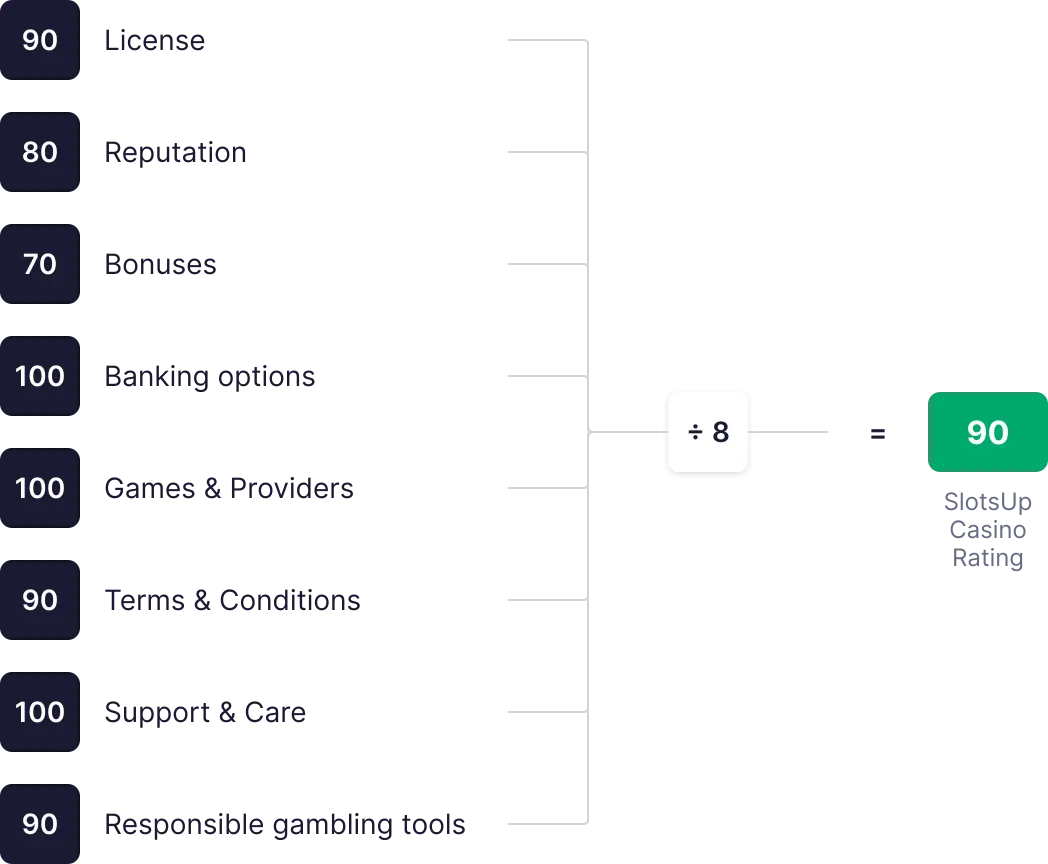 Ocena igralnice SlotsUp se izračuna na podlagi 8 ključnih metrik, vsaka ocenjena od 0 do 100. Te ocene se seštejejo, povprečijo in uporabijo za določitev končne skupne ocene.